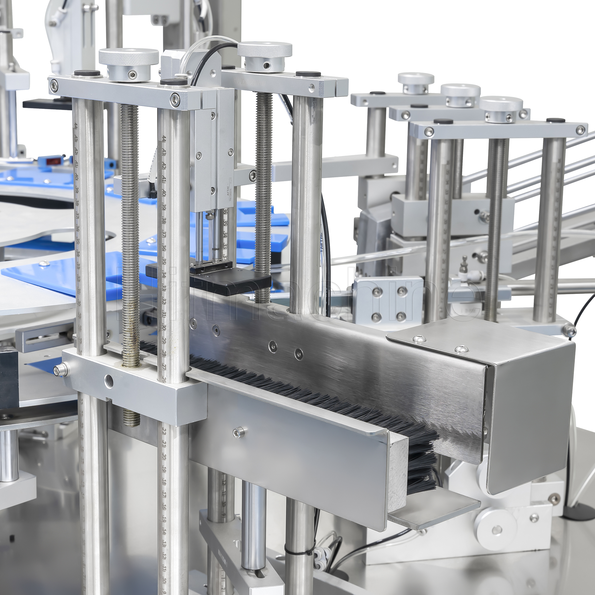 This machine uses vacuum suction cups to feed cartons into the star wheel. The empty cartons are rotated by the star wheel to the folding mechanism 1 to seal the bottom of the carton. After the finished product to be packed is manually placed into the carton, the star wheel rotates the carton to the folding mechanism 2 to seal the top of the carton. Finally, the completed product is transferred by the star wheel to the carton pushing-out mechanism for delivery.