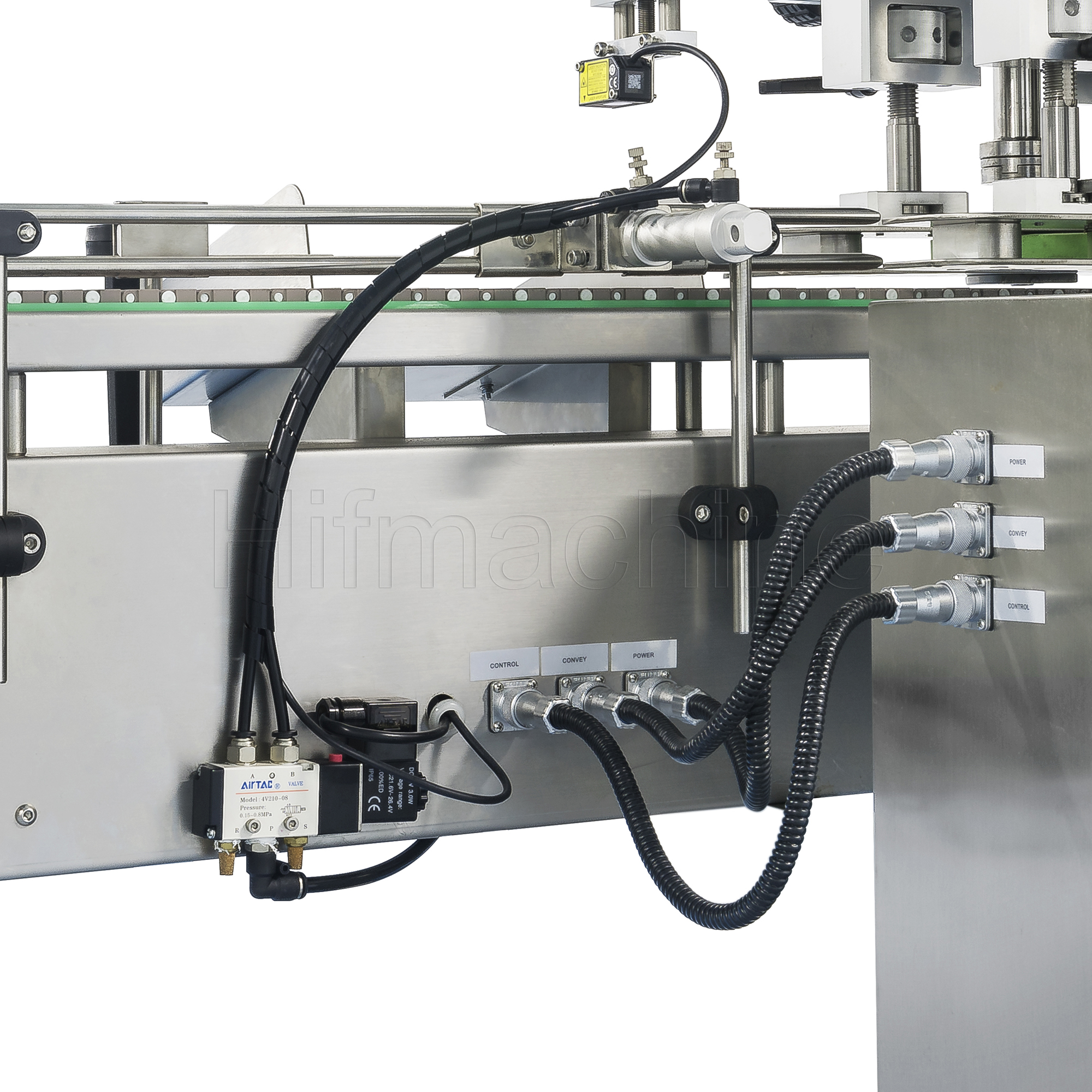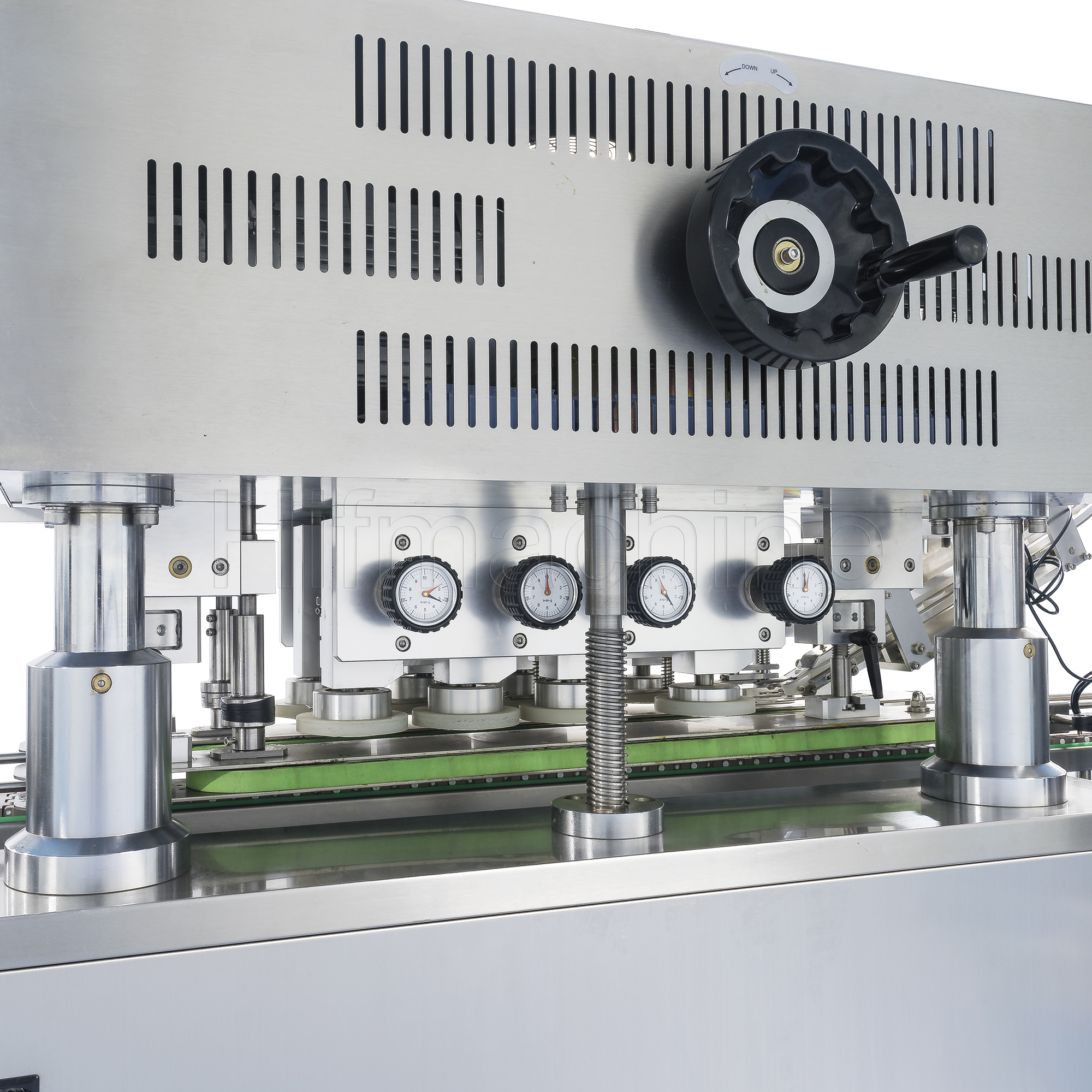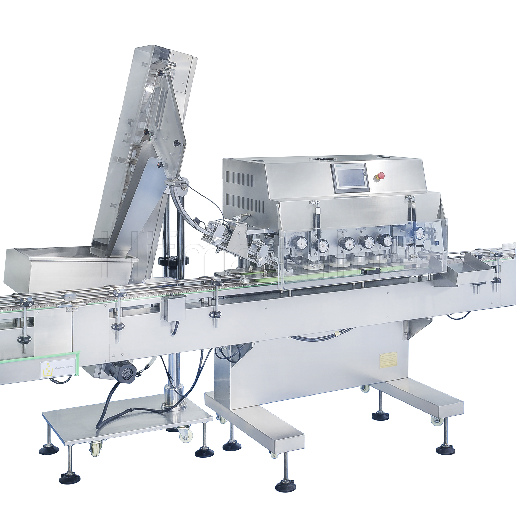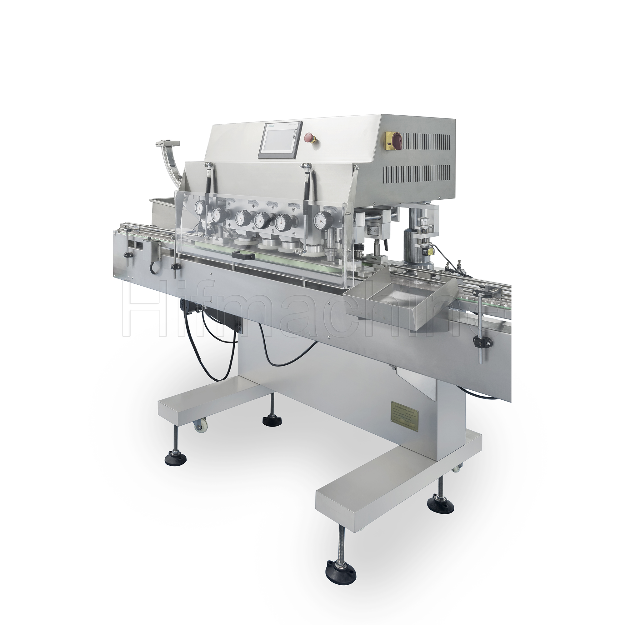 Die Hochgeschwindigkeits‑Verschließmaschine PBX-160 wird zum Verschrauben von Flaschenverschlüssen eingesetzt. So funktioniert der Arbeitsablauf: Sie spannt und fördert die Körper der Behälter mittels zweier Synchronriemen; gleichzeitig verschrauben drei Gruppen hochelastischer, verschleißfester Gummiräder die Kappen. Die Maschine ist in strikter Übereinstimmung mit den pharmazeutischen GMP‑Standards und den technologischen Anforderungen ausgelegt. Sie müssen lediglich den Abstand zwischen den beiden Synchronriemen sowie den Abstand zwischen den vier Gruppen von Gummirädern einstellen, um verschiedene runde, rechteckige und sogar die meisten unregelmäßigen Flaschen und Behälter ohne Austausch von Ersatzteilen zu verarbeiten.