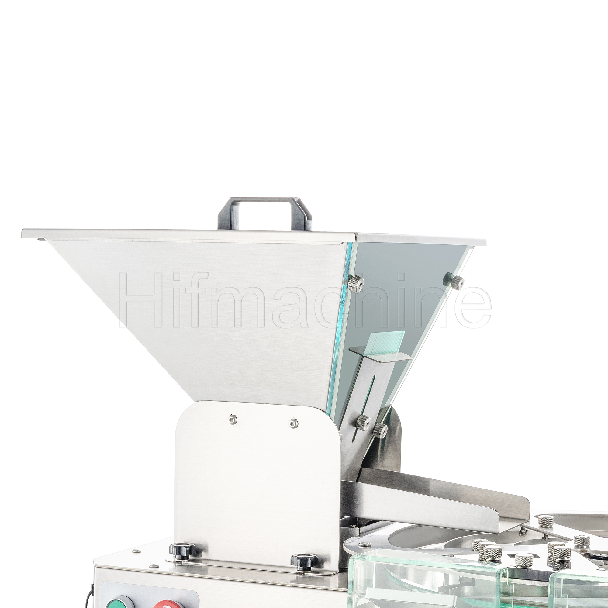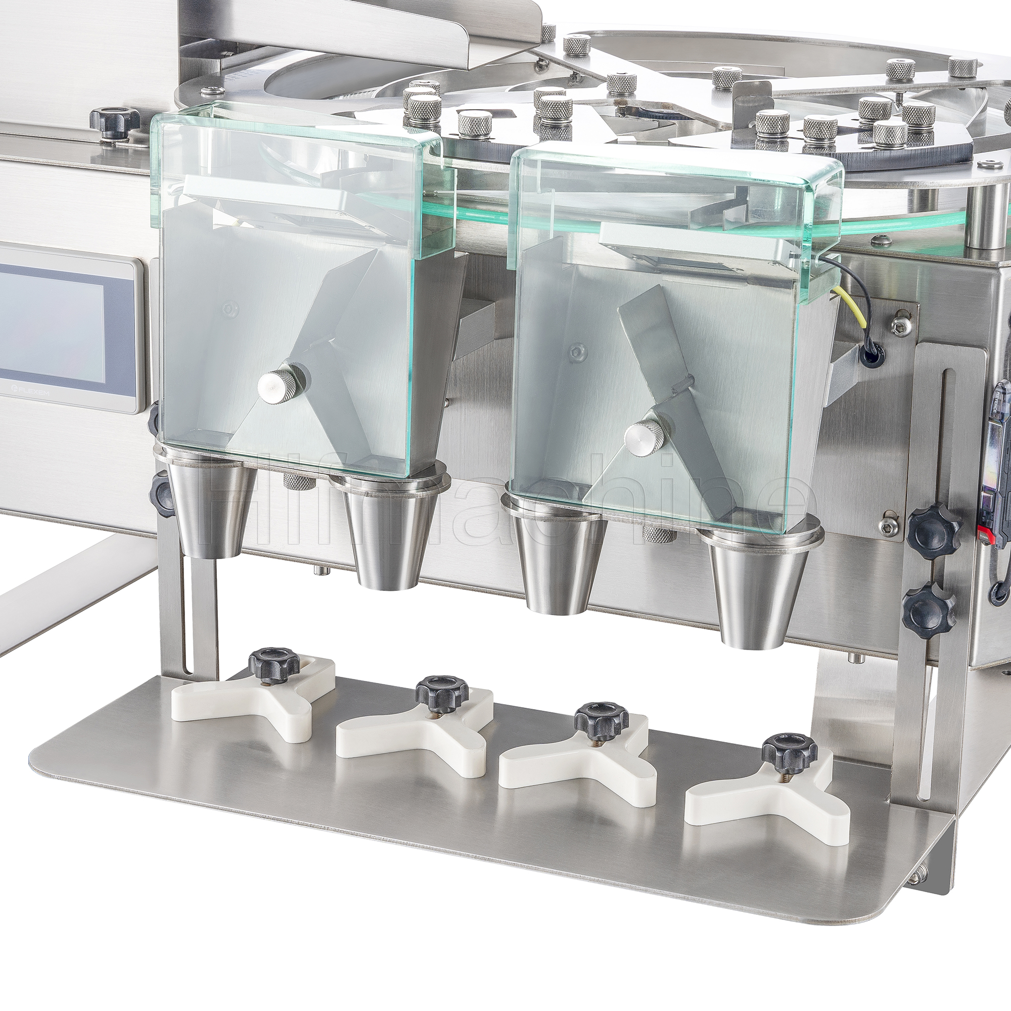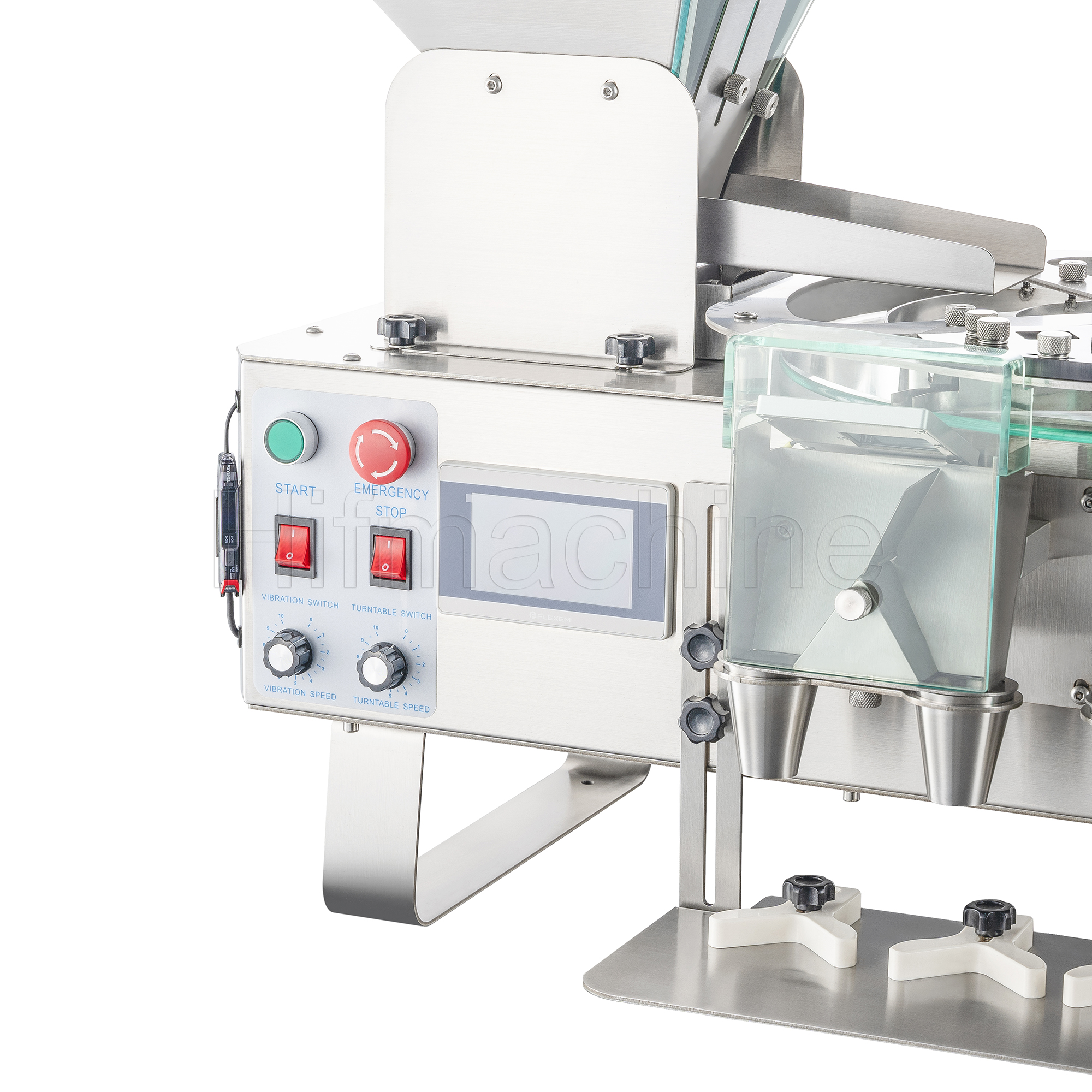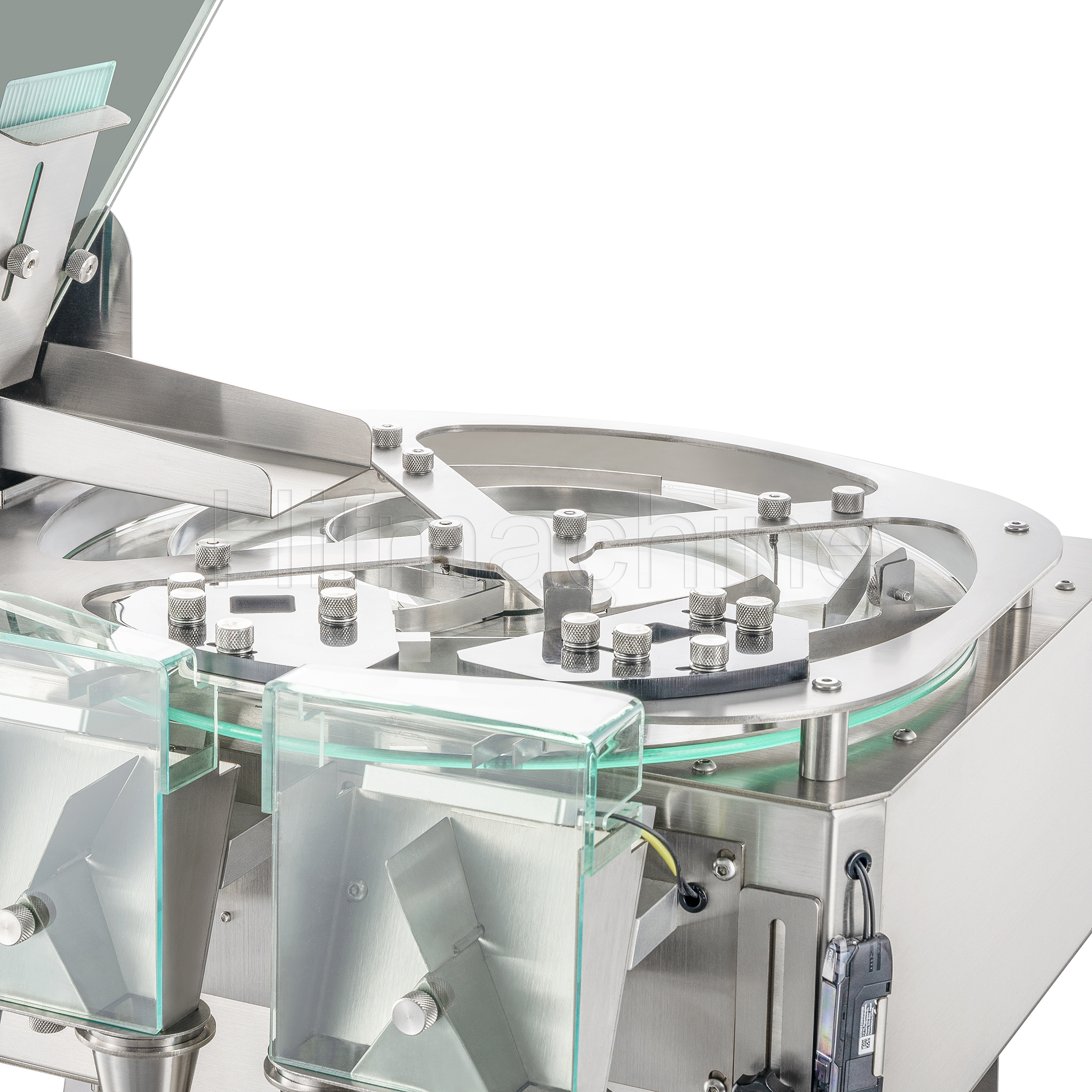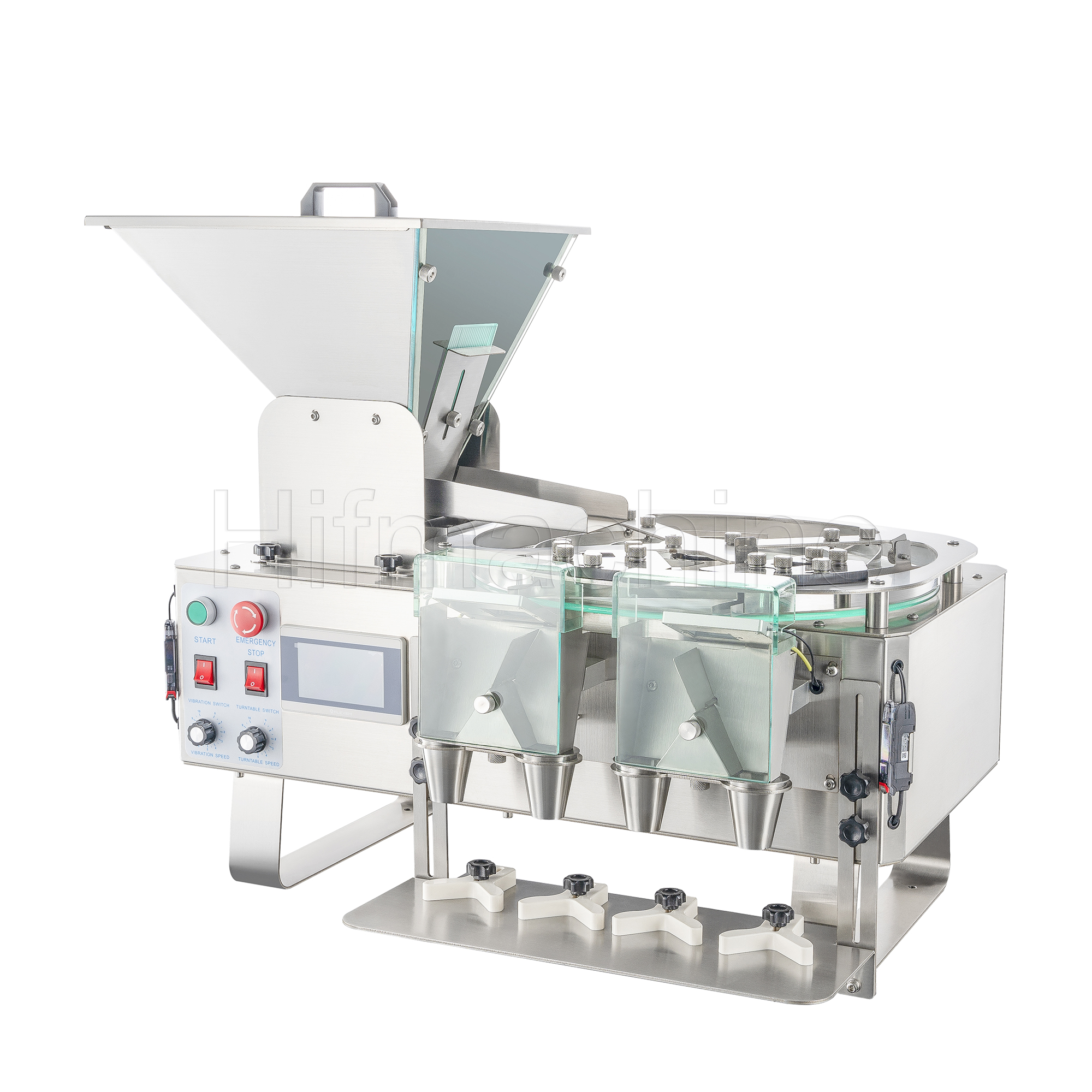 Das Produkt nutzt das Prinzip der photoelektrischen Induktion zur Erfassung und Zählung der Partikel. Die Maschine arbeitet mit einer vibrierenden Zuführung zur Separierung und einer rotierenden zentrifugalen Austragung, wodurch die Partikel einzeln und präzise gezählt werden. Am hinteren Ende der Bahn ist ein Umschalt‑Magnetventil angebracht, das die Fallbahn nach links bzw. rechts umschaltet. Sobald die linke Seite entsprechend der eingestellten Stückzahl befüllt ist, wird zur rechten Seite umgeschaltet. Gleichzeitig wird die Flasche unter dem Auslass manuell ausgetauscht, sodass ein kontinuierlicher Produktionsablauf gewährleistet ist.