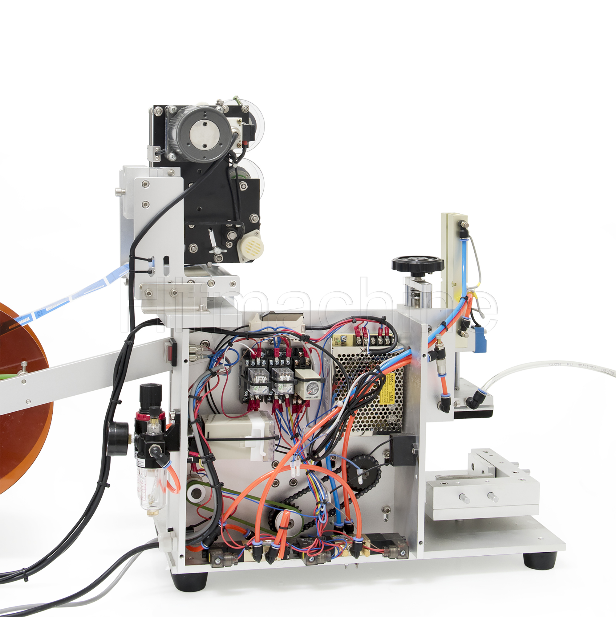 Die Maschine arbeitet mit einem hochpräzisen, intelligenten optischen Sensor (elektronisches Auge) und einer äußerst zuverlässigen speicherprogrammierbaren Steuerung (PLC) für Etikettenablösung, Etikettenausgabe und Etikettierung. Selbstklebende Etiketten werden durch Luftdruck am Etikettierkopf angesaugt und anschließend auf das Produkt aufgebracht. Die Maschine ist mit einem Codiergerät ausgestattet und kann Etikettierung und Bedruckung gleichzeitig ausführen. Klicken Sie hier, um unser Codierdrucker‑Modell zu sehen.