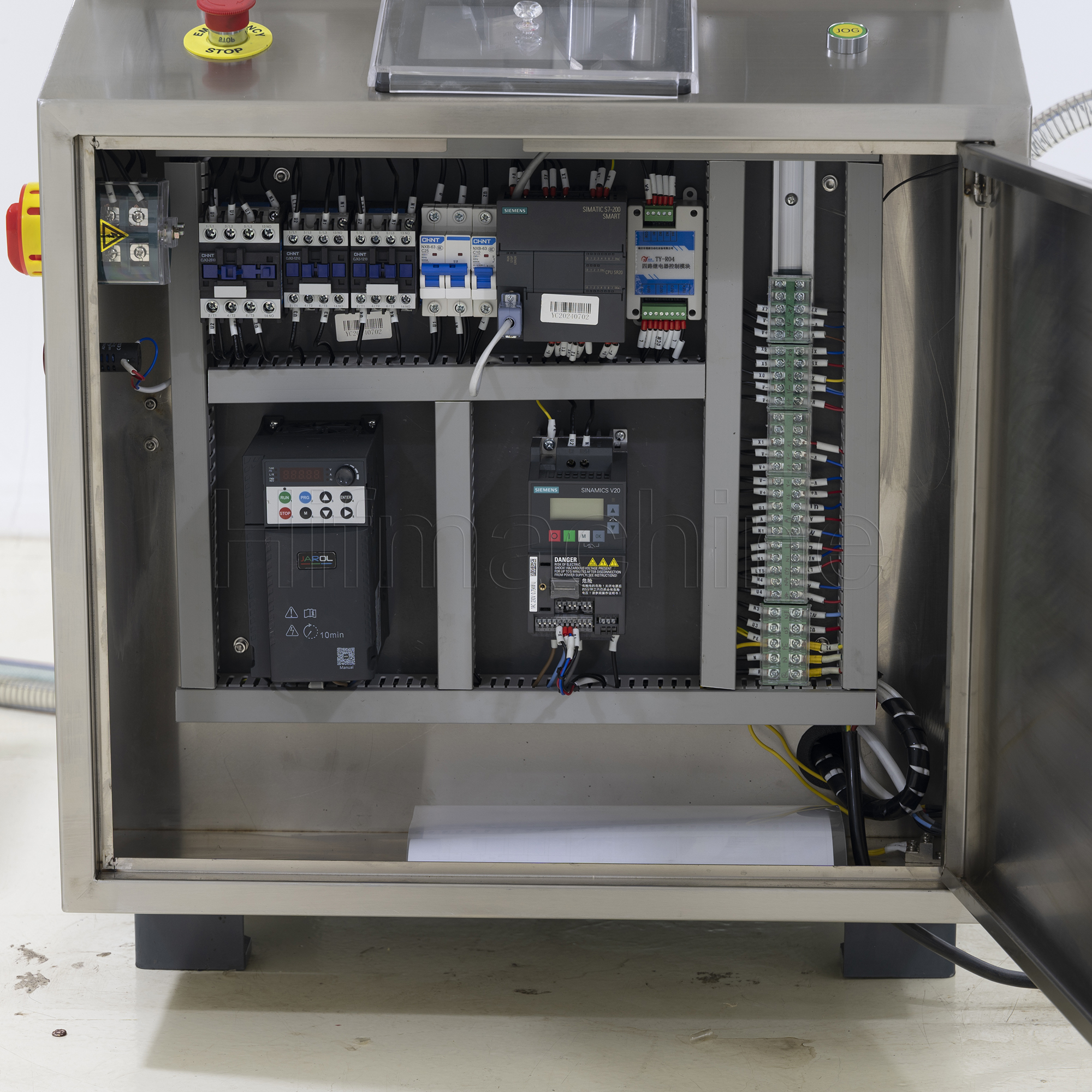 - PLC-Steuerung für zuverlässigen Betrieb. Touchscreen-HMI mit benutzerfreundlichen Bedienelementen: Produktionszähler, Hand-/Automatik-/Parametersetup-Modi, Alarme.