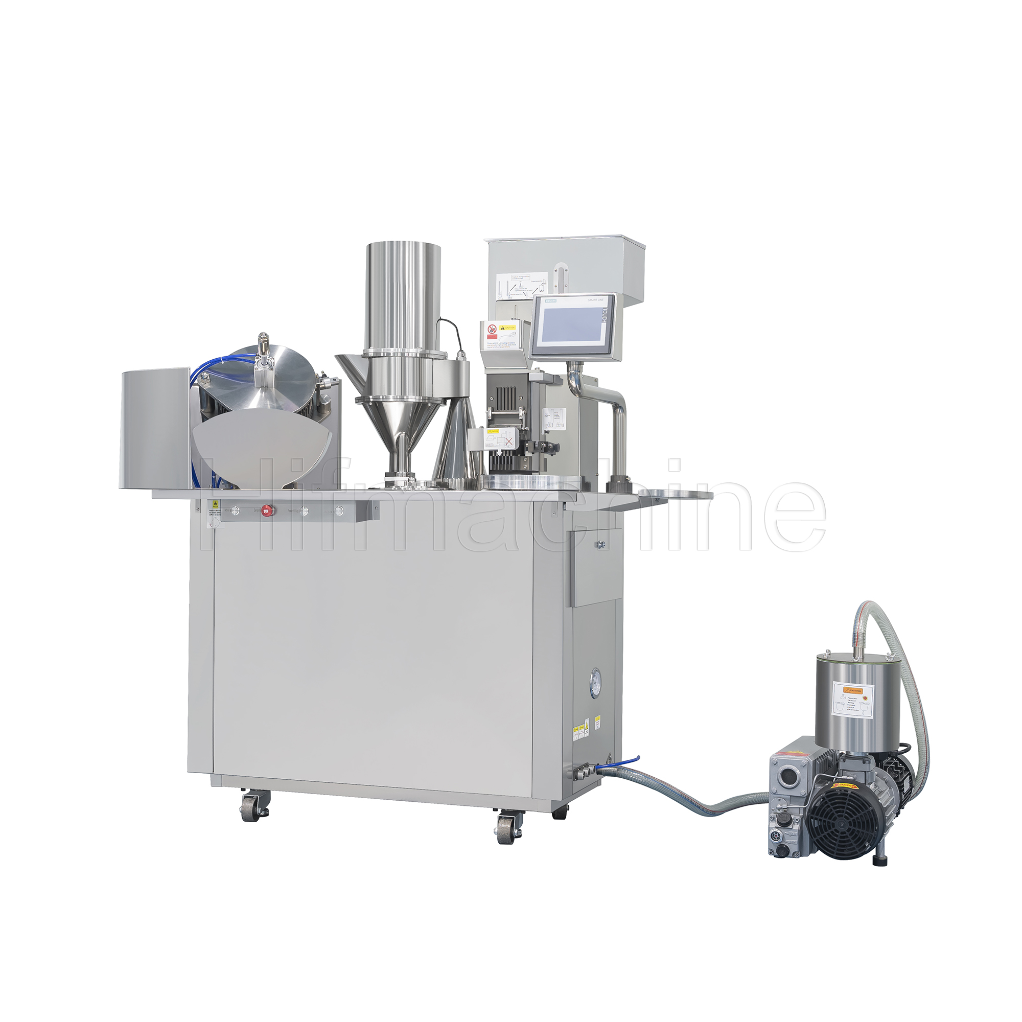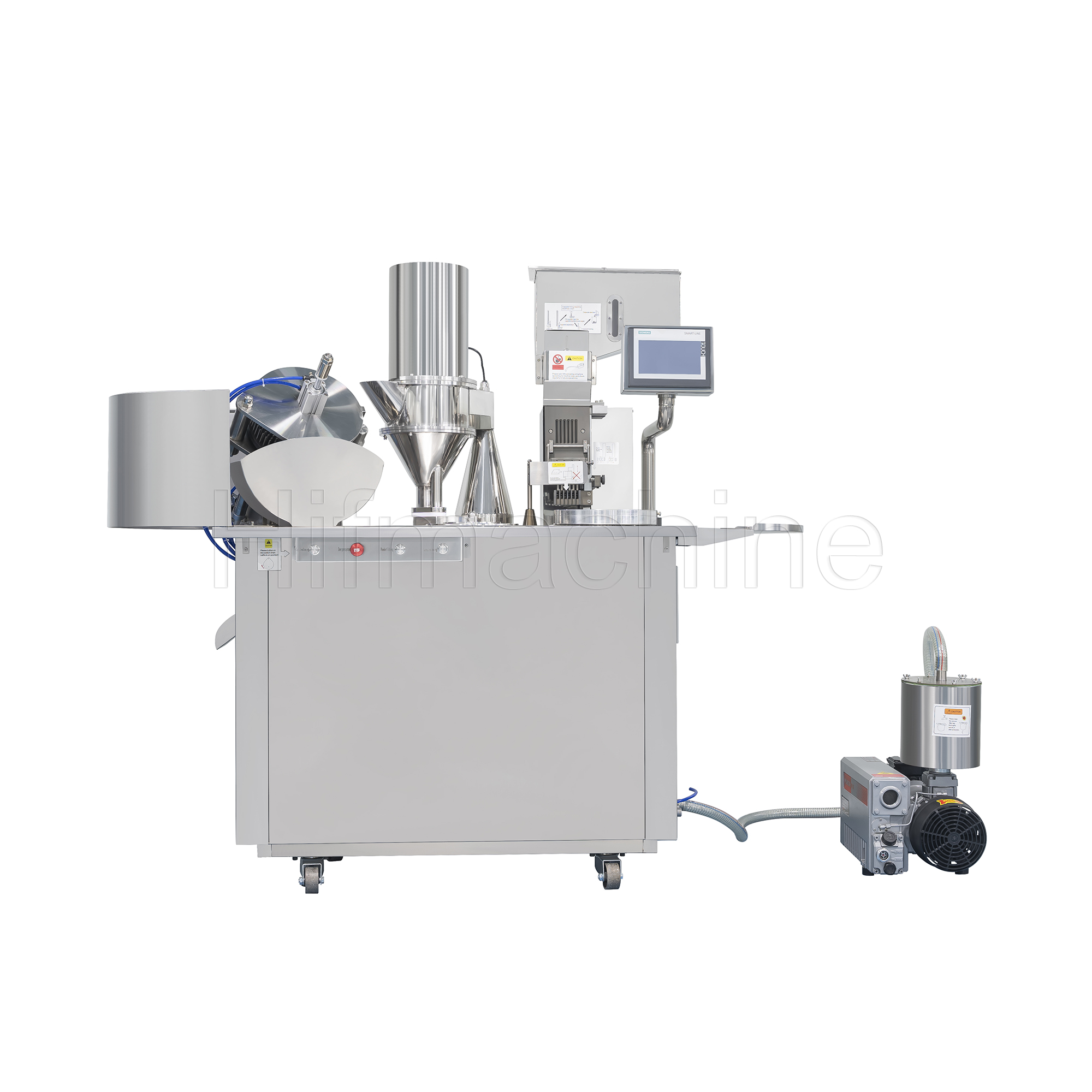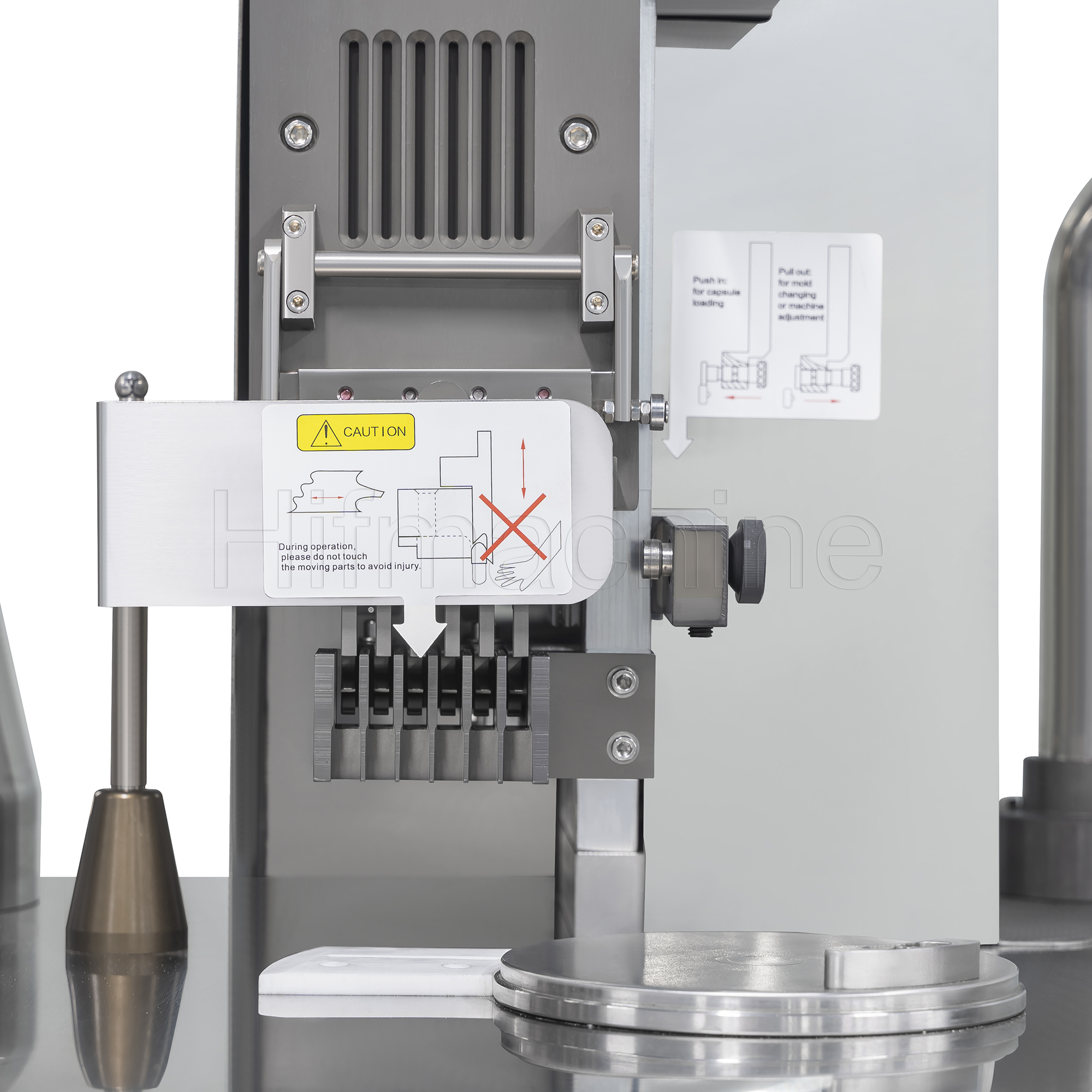 Die Maschine ist mit elektrischen und pneumatischen Steuerungen sowie einer automatischen Zähleinrichtung ausgestattet und kann den gesamten Befüllungsprozess automatisch und sequenziell ausführen – von der Positionierung der leeren Kapseln über das Trennen der Kapselhälften und das Befüllen bis zum Verschließen der gefüllten Kapseln. Sie eignet sich zum Befüllen von Kapseln der Größen 00#, 0#, 1#, 2#, 3#, 4# sowie Sicherheitskapseln. Auf Anfrage kann sie für Kapseln von Größe 000# bis Größe 5# angepasst werden; dabei verringert sich jedoch die Befüllgeschwindigkeit.