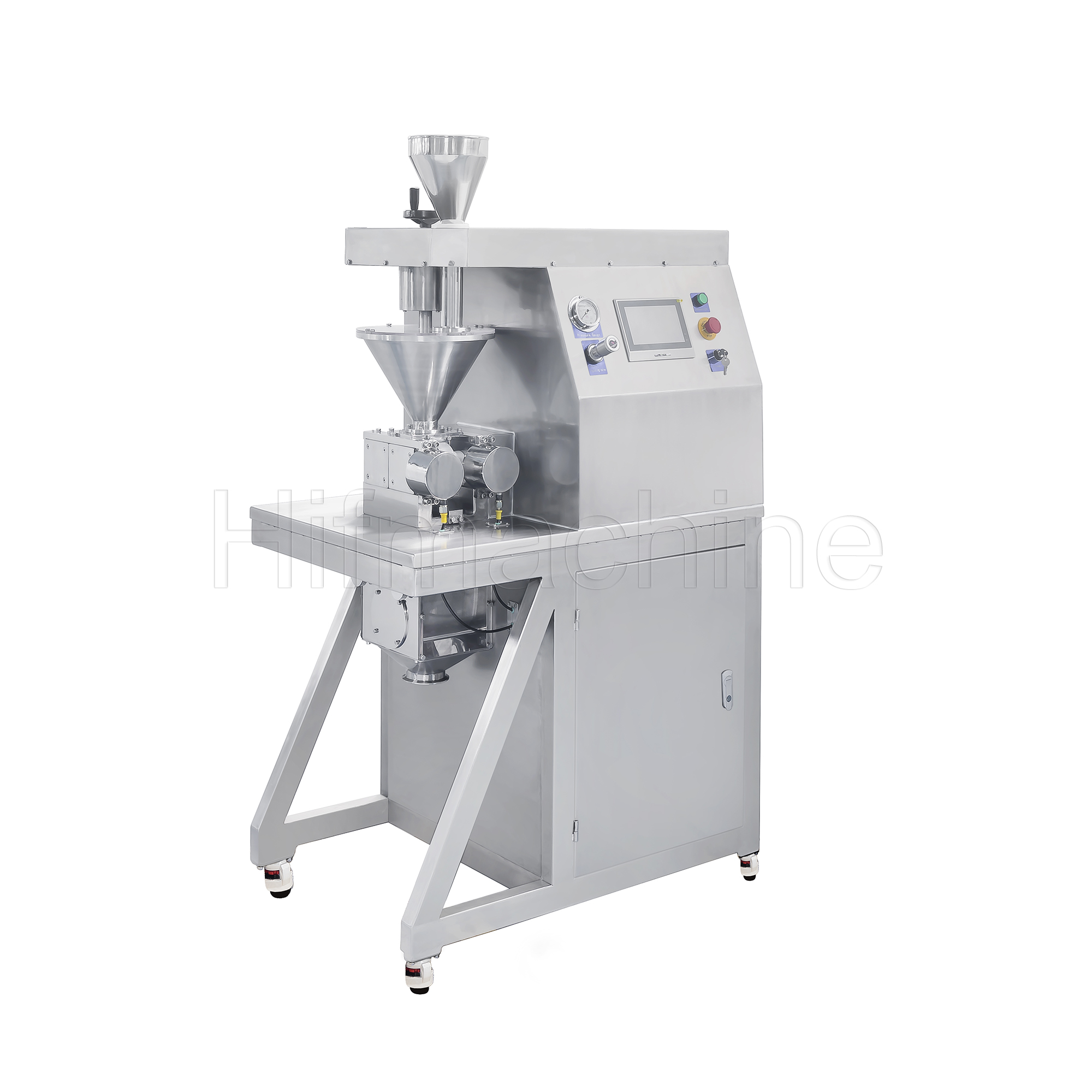 Der Walzenkompaktierer (Granulator‑Kompaktor) verfügt über ein Schneckenfördersystem, das das Pulver gleichmäßig zwischen zwei Druckwalzen zuführt. Zwischen diesen Walzen werden die Pulver zu einem Band (Laminat) oder zu Bruchstücken/kleinen Pellets verdichtet und anschließend durch eine niedrigschervorgelegte Mühle zerkleinert. Bei korrekter Kompaktierung kann das Produkt danach einer Feinvermahlung und Endmischung zugeführt werden, bevor es in die Tablettierung übergeht.