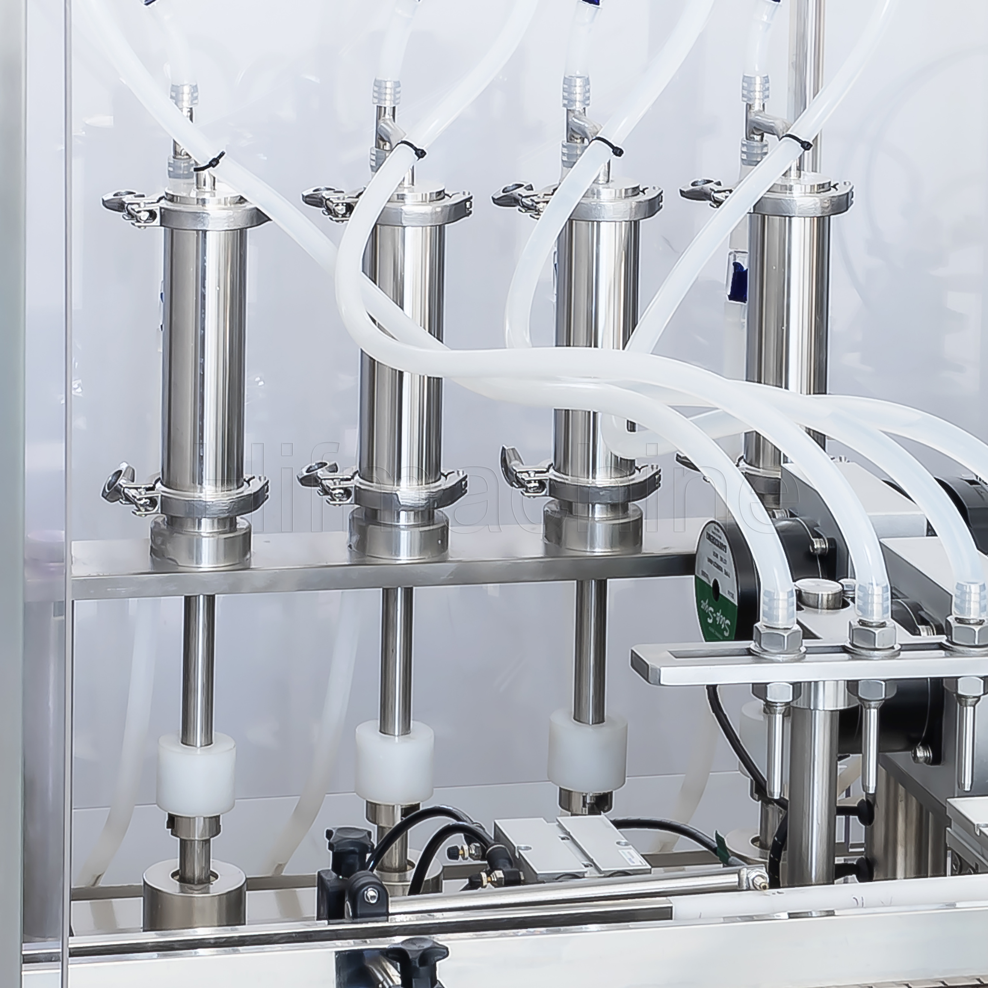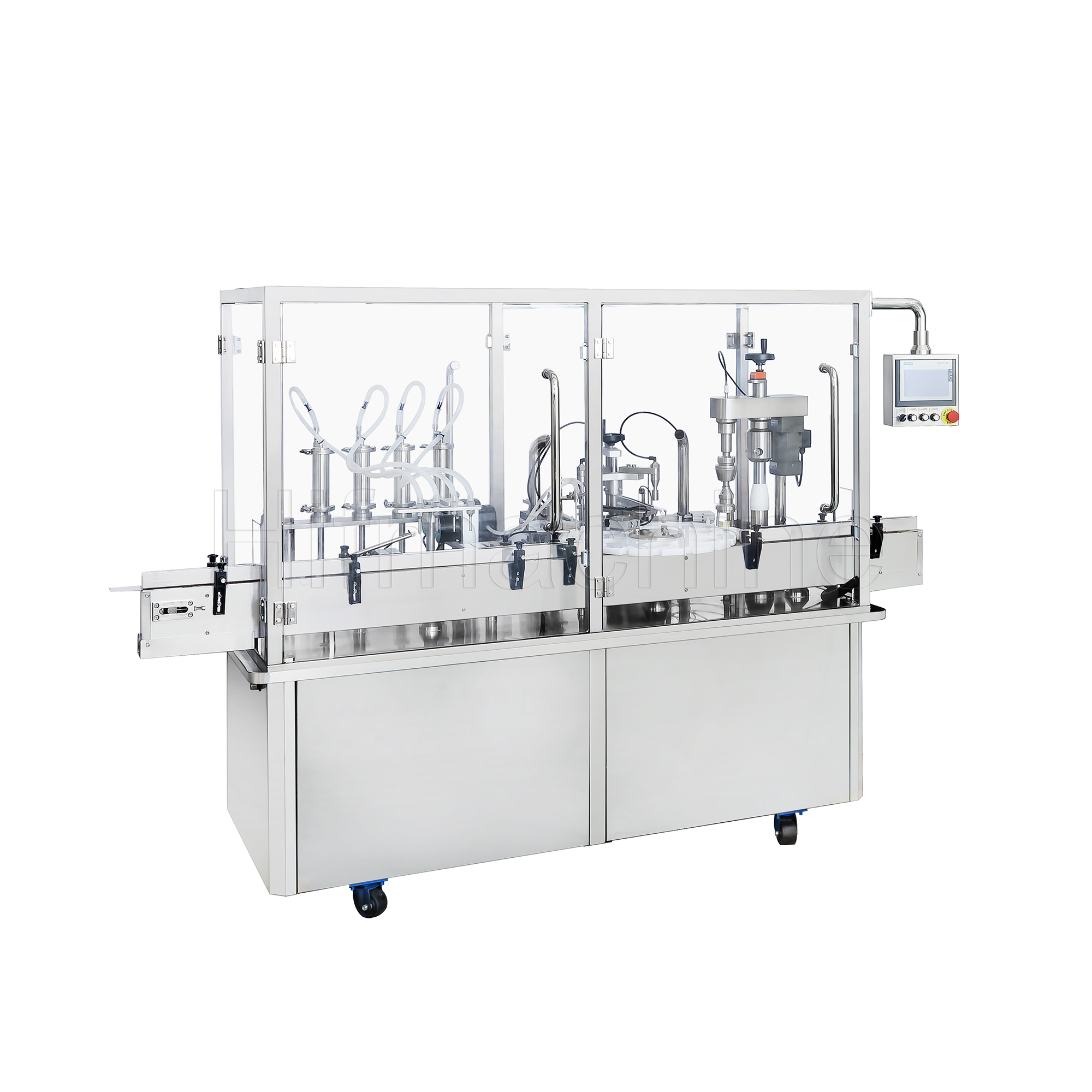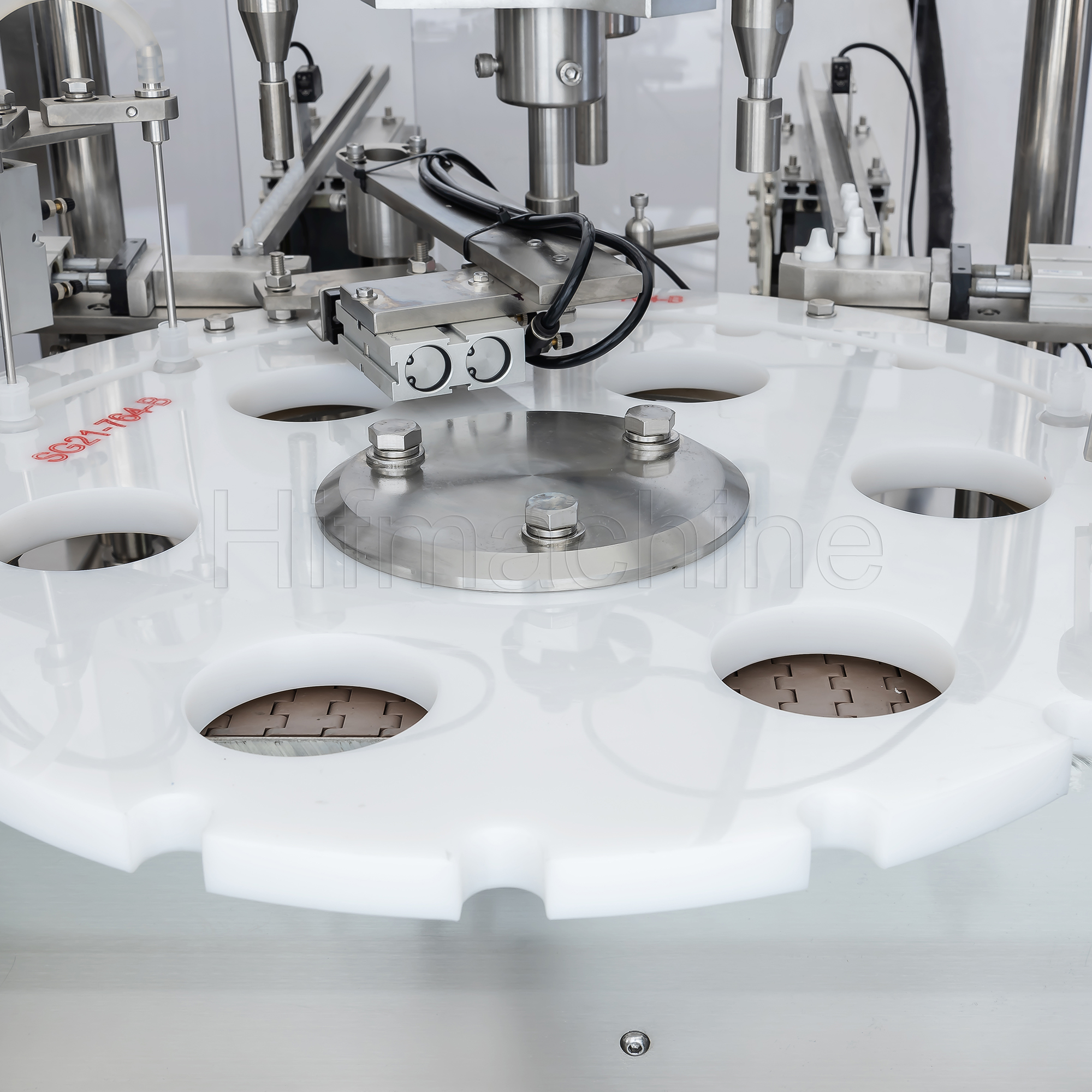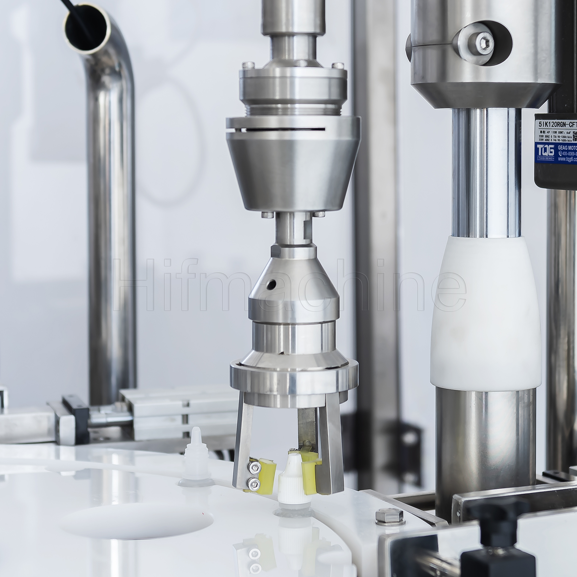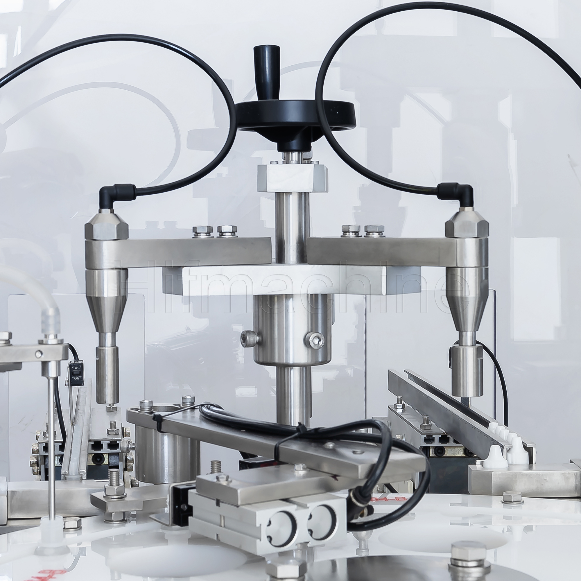 Este tipo de máquina dosificadora y roscadora de tapas para frascos con gotero es adecuada para llenar frascos con dosis moderadas. Dispone de dos tipos de llenado: mediante bomba de pistón lineal de cuatro cabezales y bomba peristáltica de doble cabezal. La máquina realiza la colocación y rosca de las tapas cuando las botellas están en posición fija sobre el disco rotativo. Su diseño es compacto y eficiente, permitiendo una fácil coordinación con otros equipos para conformar una línea de producción completa. Las partes que entran en contacto con el líquido, como la bomba dosificadora y la boquilla de llenado, están fabricadas en acero inoxidable SAE 316L. Se recomienda disponer de un tanque de almacenamiento de aire comprimido (200–300 L) junto con la máquina, para garantizar una presión estable y un funcionamiento óptimo de los componentes neumáticos. La máquina viene equipada con una cubierta protectora fabricada en placa de policarbonato y estructura de acero inoxidable 304.