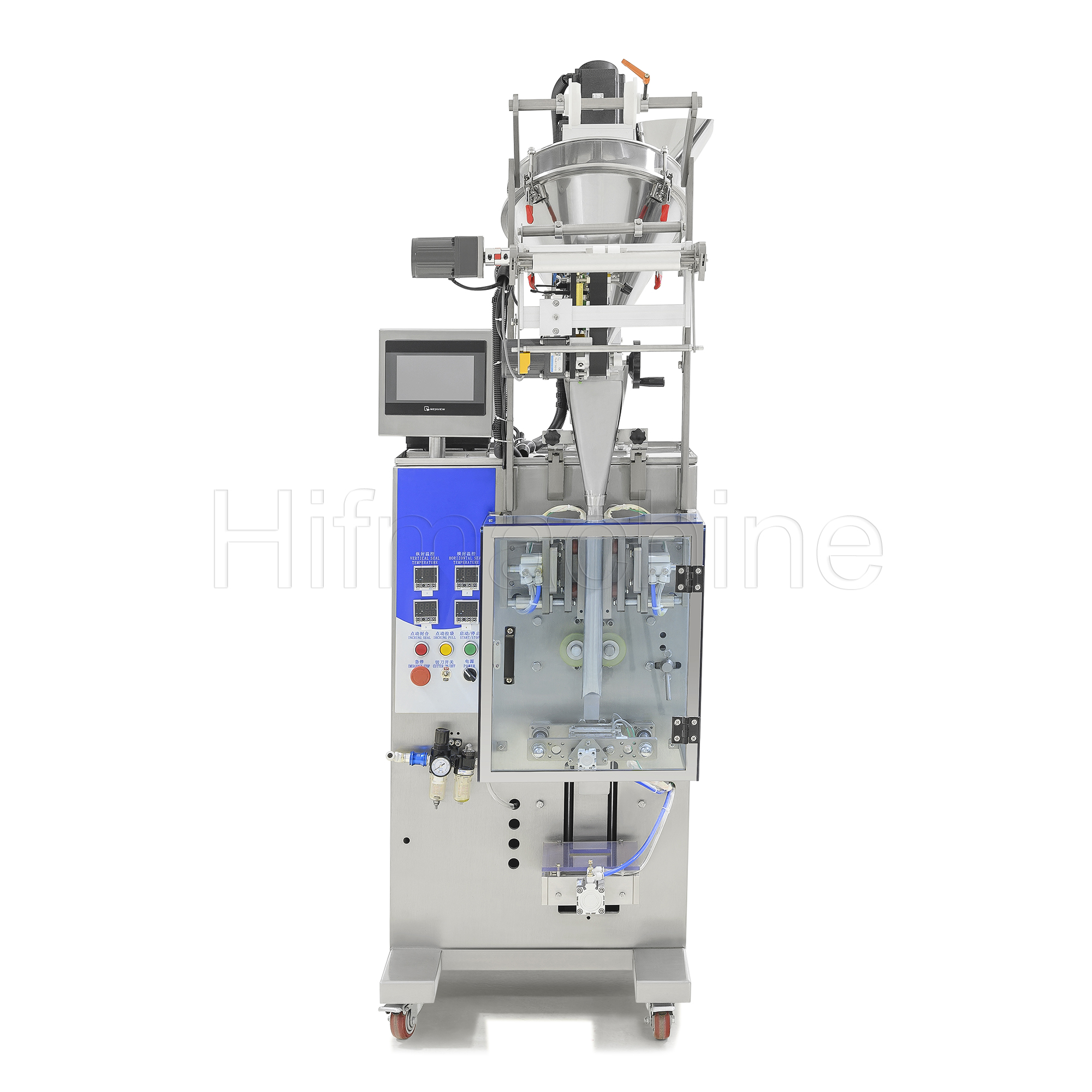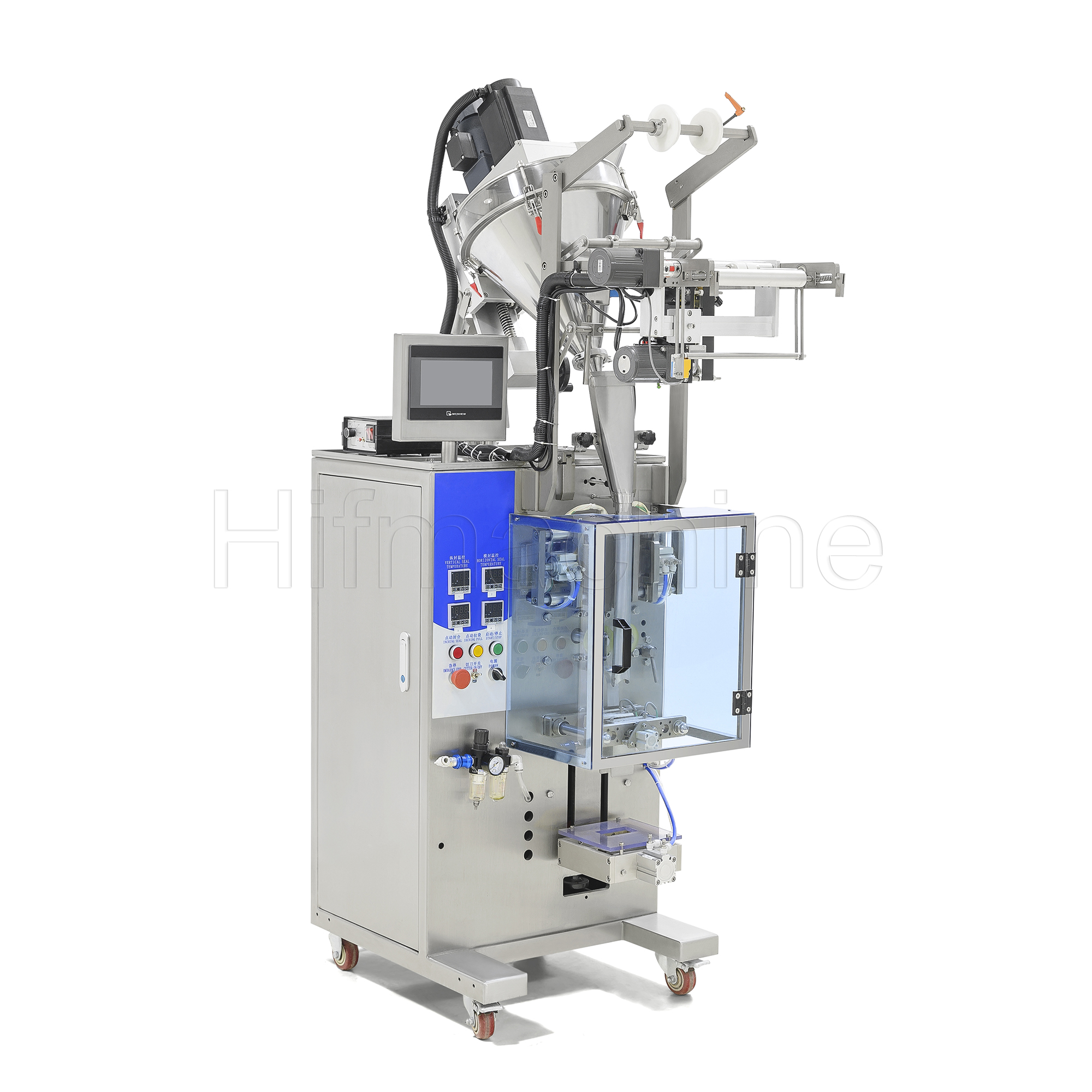 - Producción eficiente: Realiza automáticamente los procesos de formación de bolsas, dosificación, llenado, sellado, impresión de fecha de producción, corte y conteo.