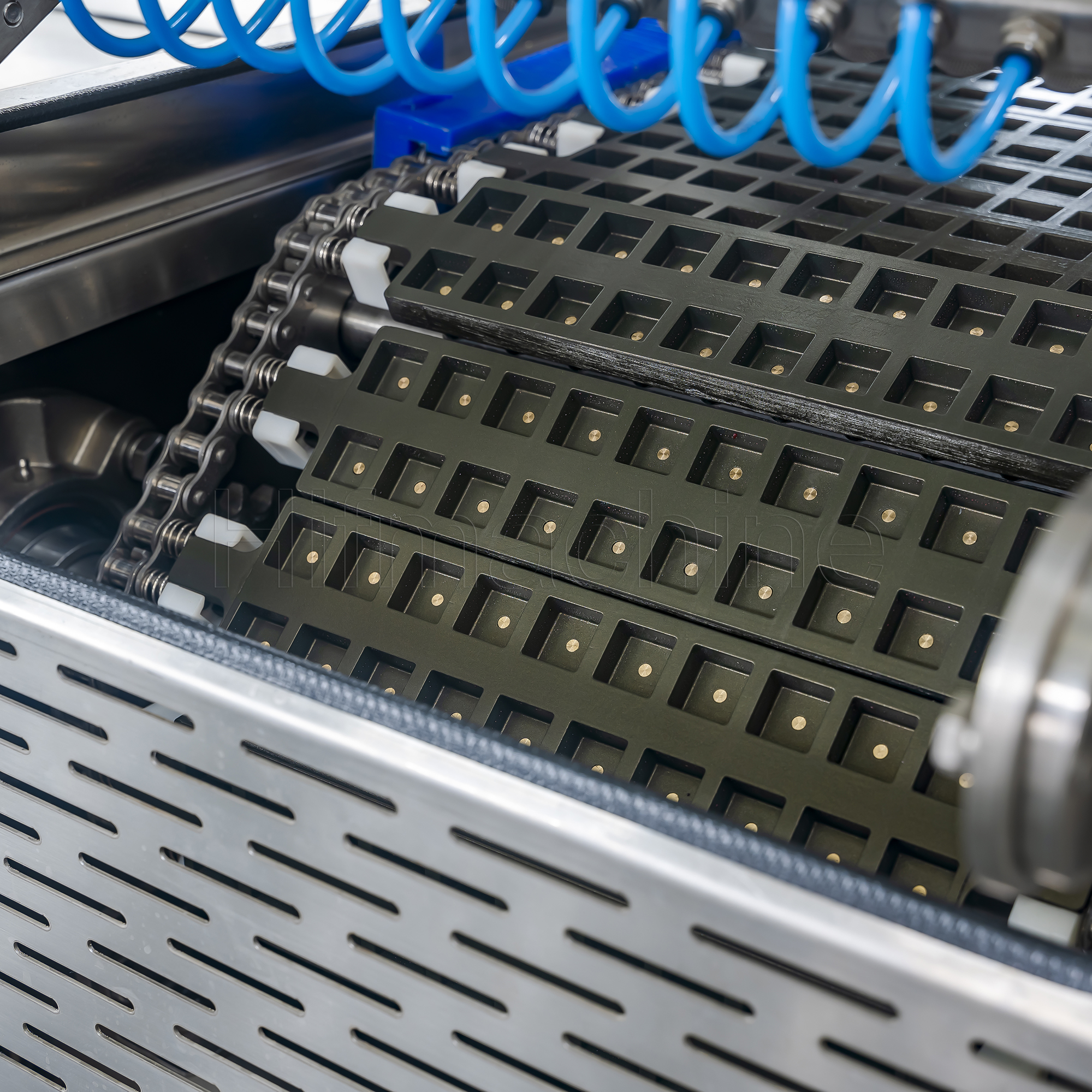 La tecnología de alta precisión empleada en los pistones y mangas de cobre asegura la uniformidad del peso de los caramelos.
