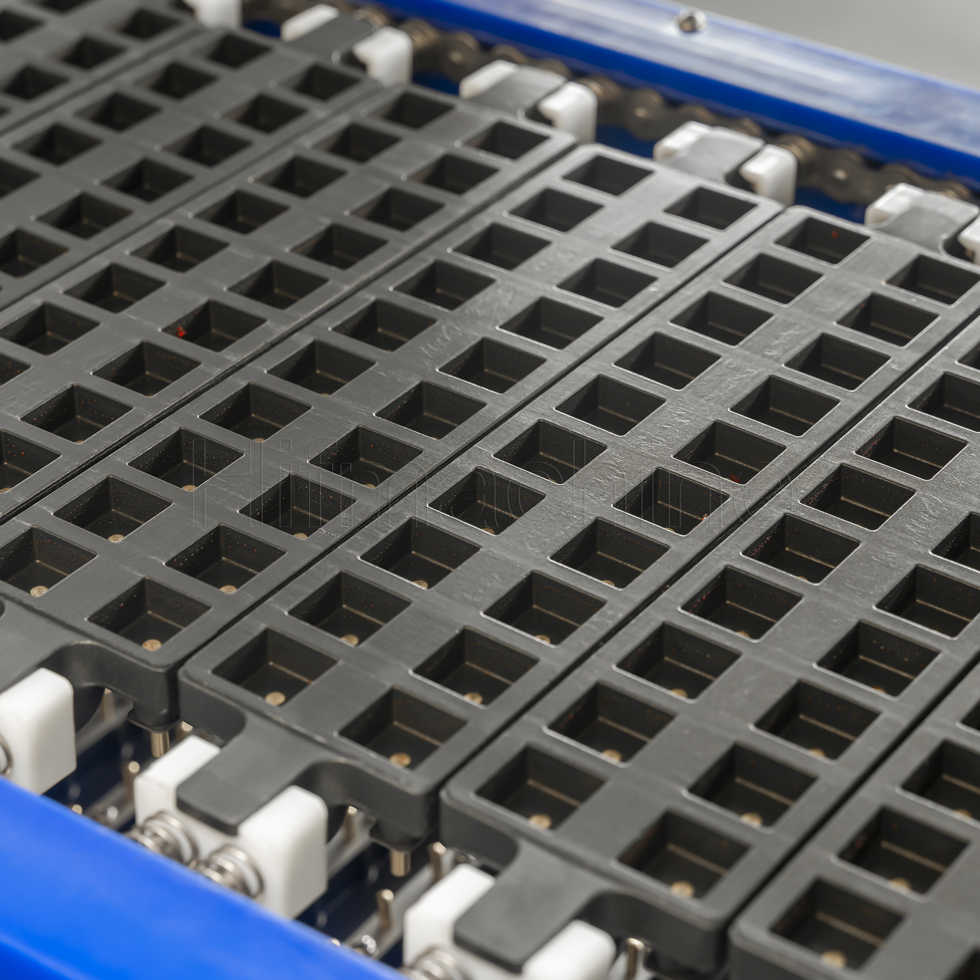 Nuestra cadena es de acero inoxidable con tratamiento de endurecimiento superficial, fácil de limpiar y con funcionamiento suave.