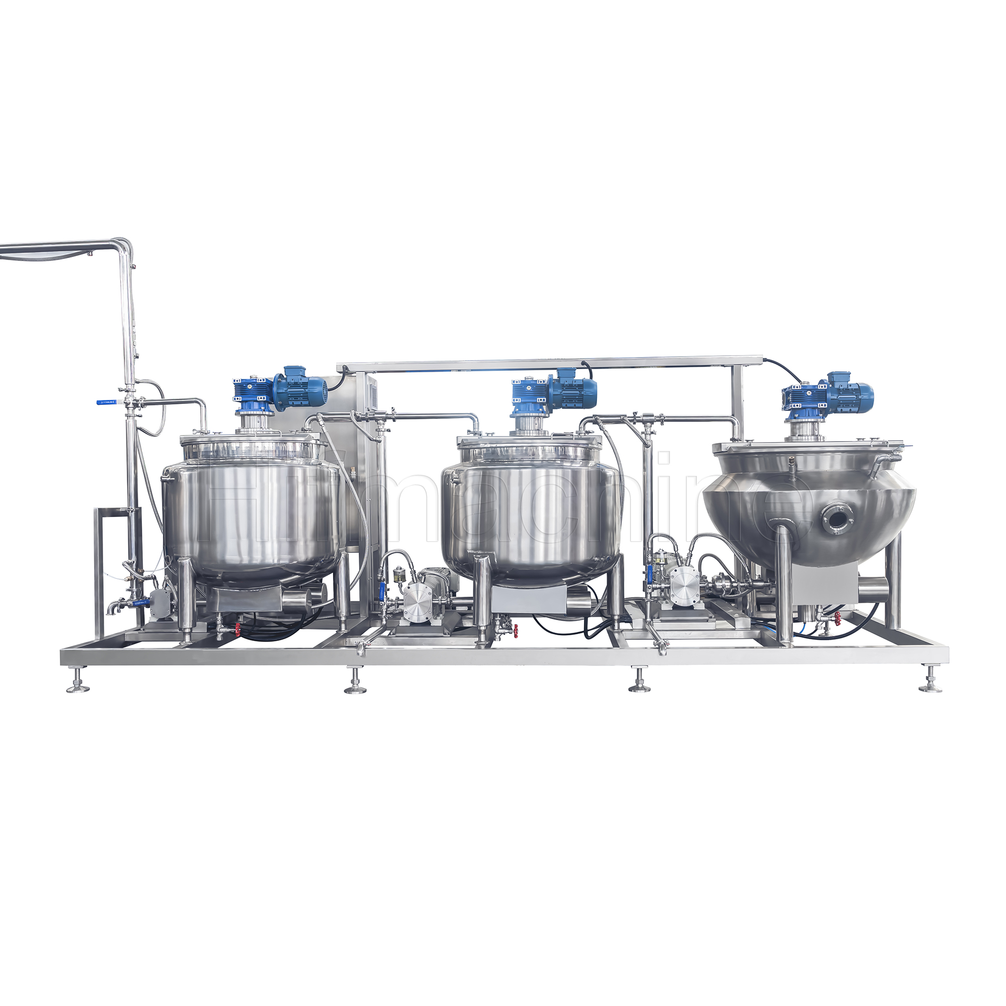 El equipo utiliza calentamiento eléctrico. El tanque vertical con camisa tiene agitación lateral para evitar que los materiales se sedimenten en el fondo. Las temperaturas pueden alcanzar hasta 150 °C. Esta línea de producción se usa principalmente para lograr una completa disolución de las materias primas.