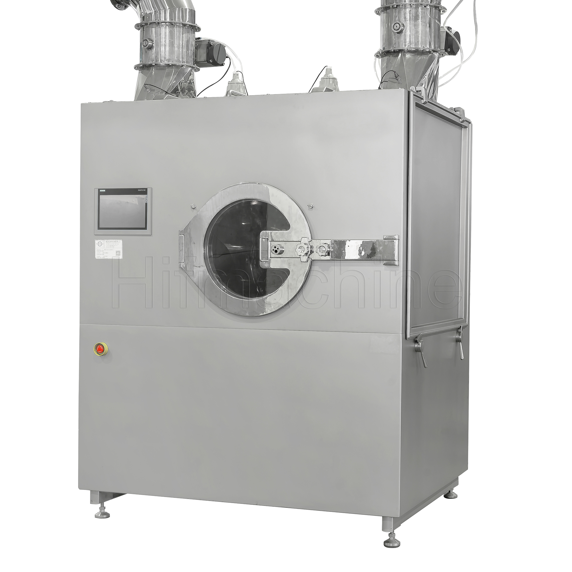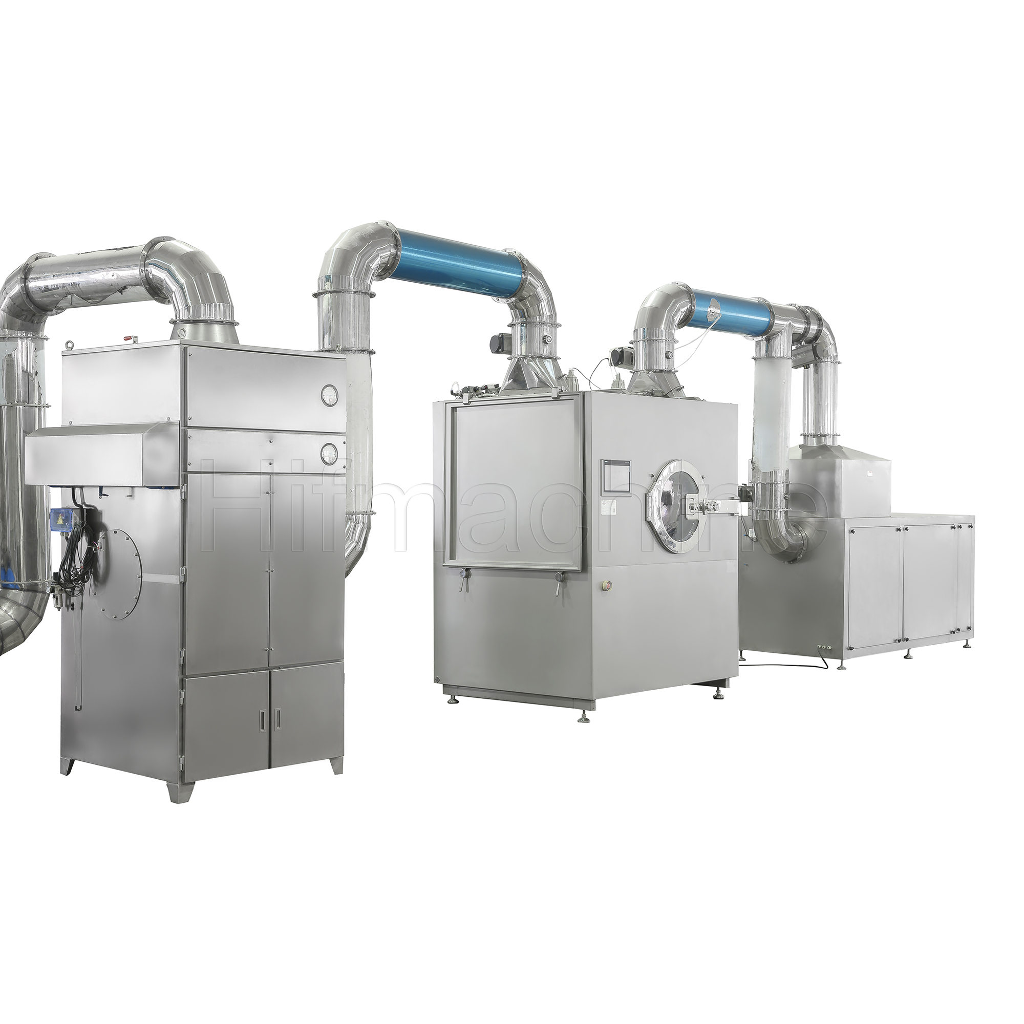 Dentro del tambor rotativo de la máquina de recubrimiento, las tabletas sin recubrir se desplazan siguiendo una trayectoria continua y compleja. Durante este proceso, controlado por el sistema de programación, un medio líquido es pulverizado (o goteado) sobre la superficie de las tabletas según la secuencia y parámetros tecnológicos seleccionados, empleando para ello una bomba dosificadora y una pistola pulverizadora (o tubo de goteo para recubrimiento con azúcar). Al mismo tiempo, el aire caliente limpio y previamente filtrado procedente de la cabina de aire caliente atraviesa la cama de tabletas, sale por la parte inferior del tambor y se expulsa tras ser depurado, logrando así formar rápidamente una película o recubrimiento de azúcar firme y uniforme sobre las tabletas.