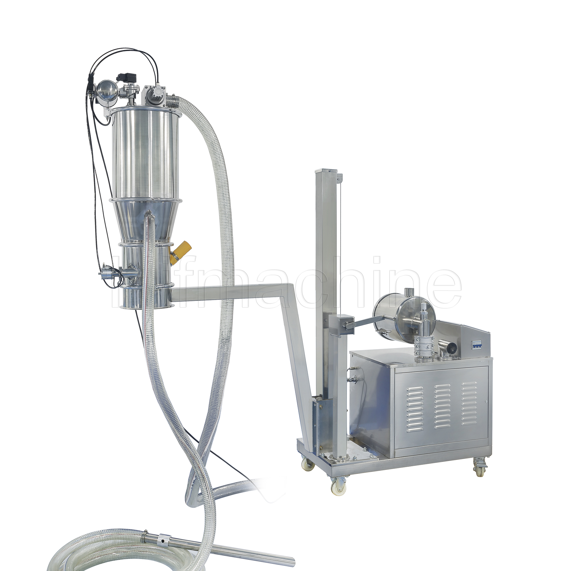 El alimentador al vacío consta de una bomba de vacío (sin aceite ni agua), tubo de succión de acero inoxidable, manguera flexible, filtro de polietileno (PE) o de acero inoxidable SUS 316, dispositivo de limpieza por aire comprimido, dispositivo neumático de descarga, tolva de vacío y dispositivo automático de control de nivel.