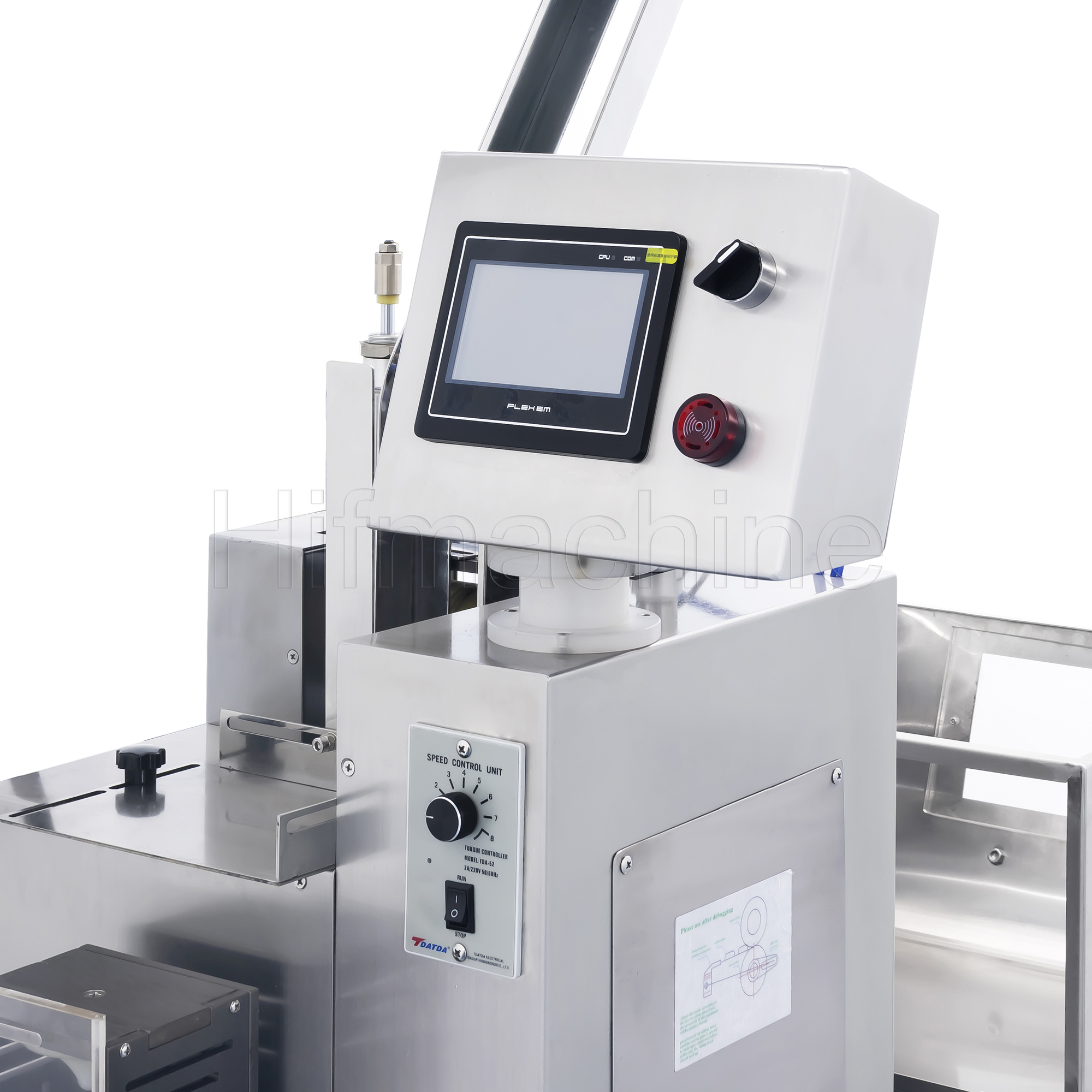 - Control inteligente mediante PLC y detección por sensor de nivel de material. Al estar monitoreado por contador fotoeléctrico, una vez configurados los números de comprimidos y láminas blíster, la máquina calculará automáticamente la capacidad de producción.
