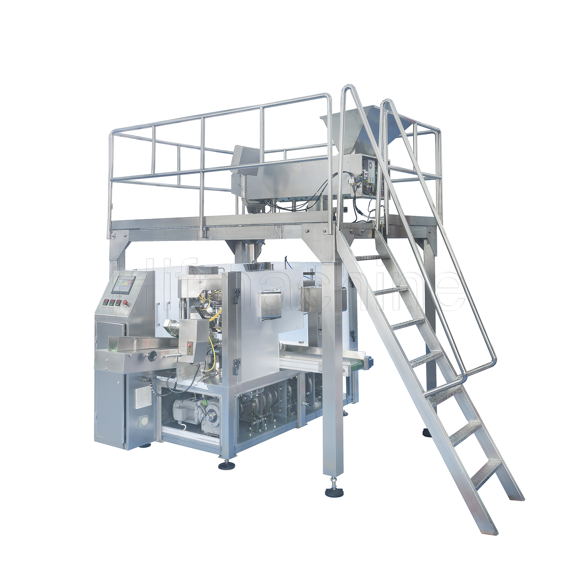 - Distributeur automatique de sachets préformés à rotation intermittente, machine d’ouverture et de fermeture combinée avec une balance de pesée automatique multi-têtes combinées, plateforme de travail suspendue et alimentateur en vrac à élévateur en Z.